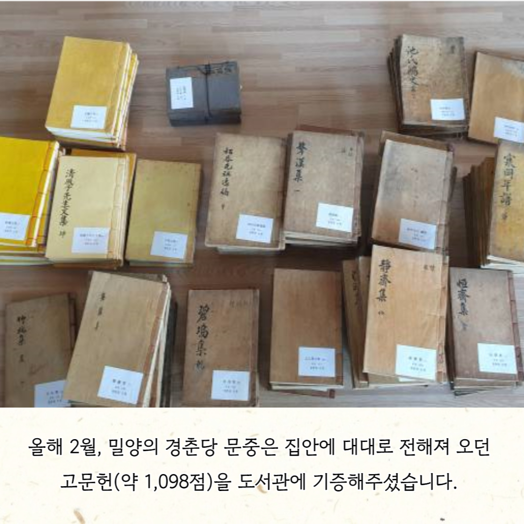 올해 2월 여주이씨 밀양파 경춘당 문중에서 고문헌 1,098점을 우리 도서관으로 기증해 주셨습니다. 경춘당 문중과 기증된 자료를 소개합니다. |