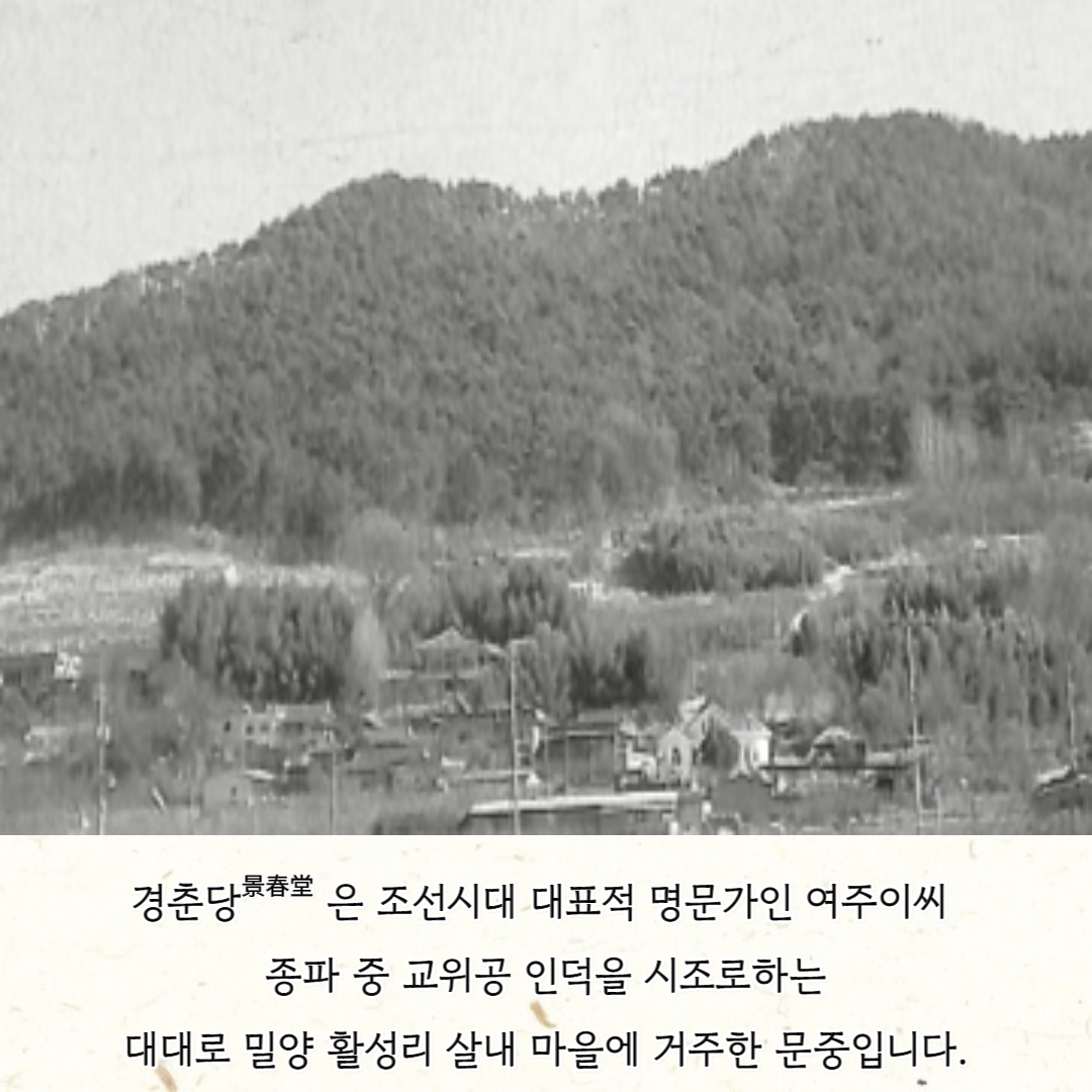 경춘당 문중은 교위공파에 해당하며 문절공 기우자 이행 선생과 밀양으로 낙향한 충순위공 이사필의 후손이자 여주이씨 22세손인 이표를 최존위로 모시는 문중으로 대대로 밀양 활성리 살내 마을에 거주하여 대소가를 형성하였습니다.