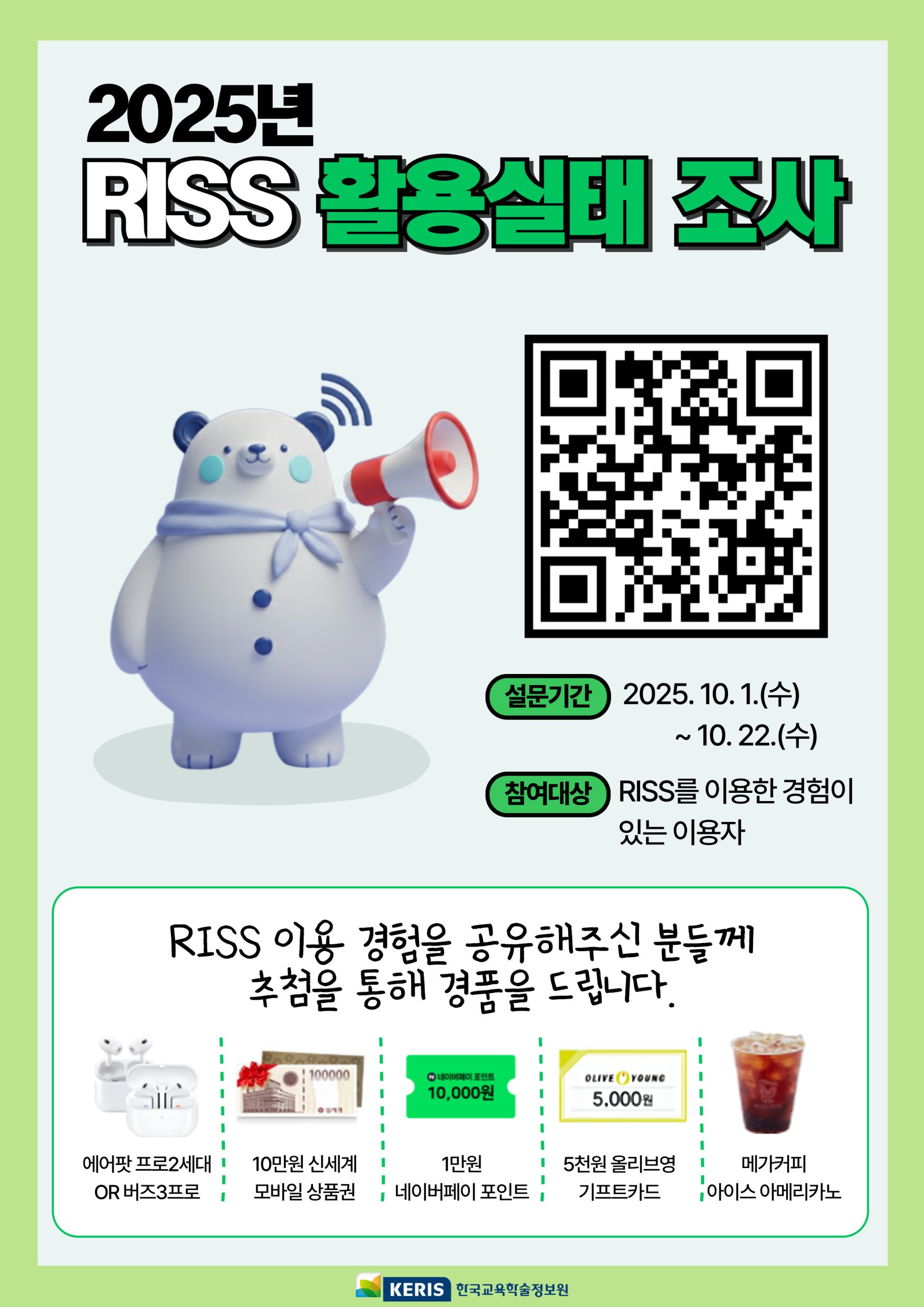 KERIS(한국교육학술정보원)에서 “2025년 학술연구정보서비스(RISS) 활용 실태 조사”를 실시합니다.